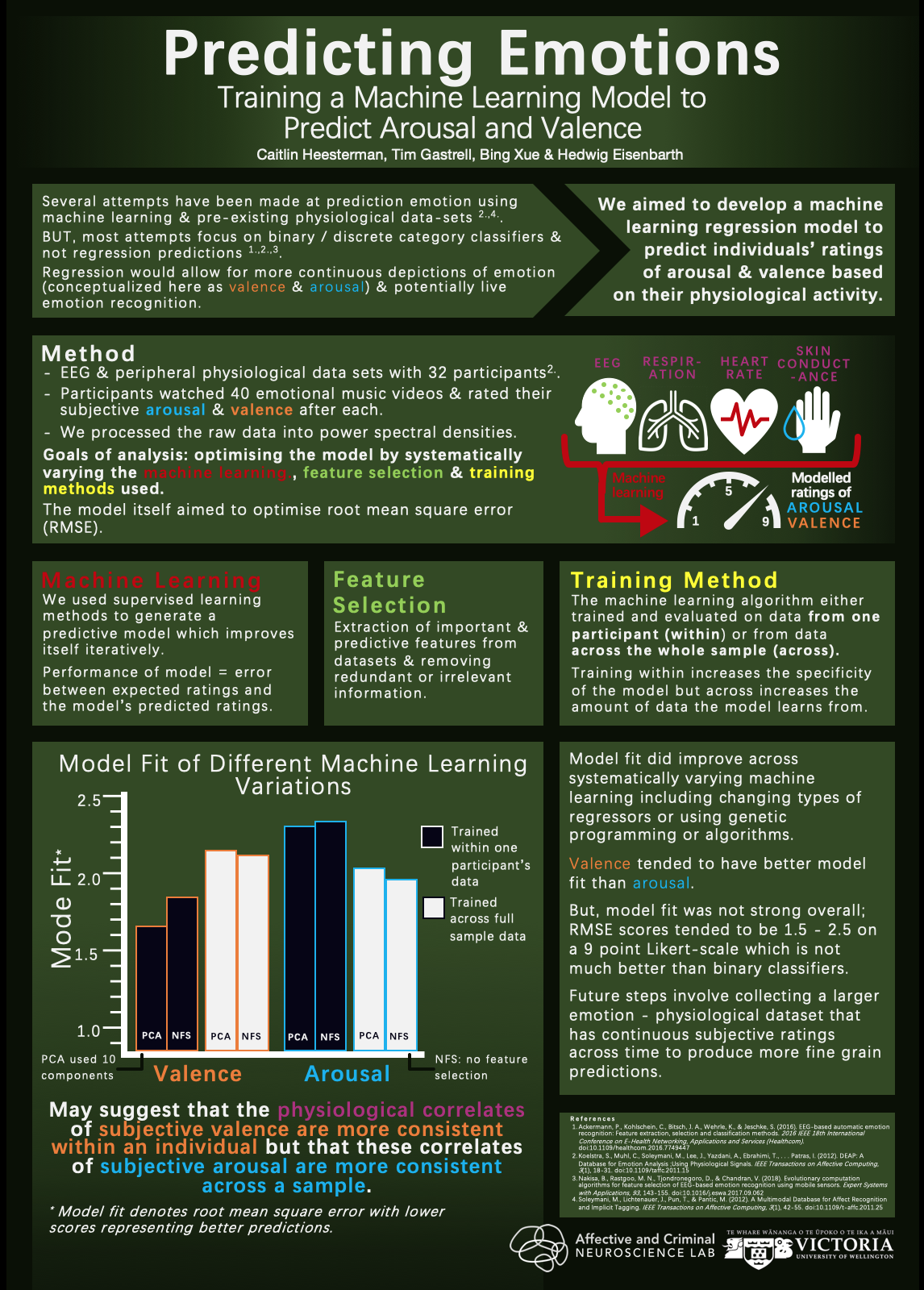 - Tim Gastrell, "Development of an emotional arousal sensitive brain activity pattern (Emotional Arousal Pattern)", Victoria University of Wellington, 16 Nov 2018 -- 22 Feb 2019 (supervised by Dr Hedwig Eisenbarth and Prof. Bing Xue Summer Gold Poster Award in Summer Gold Competition for 2019 :